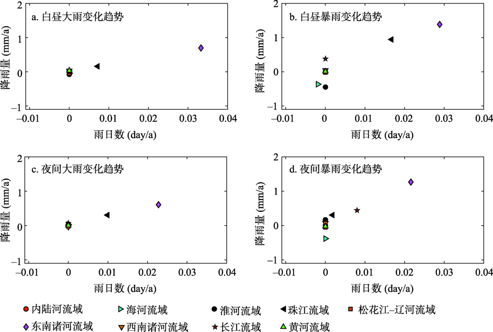 图5 1961—2016年九大流域昼夜大雨和暴雨的降雨量和雨日数的变化趋势 |