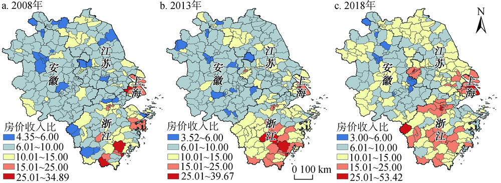 图4 2008—2018年长三角房价收入比空间分布格局 |