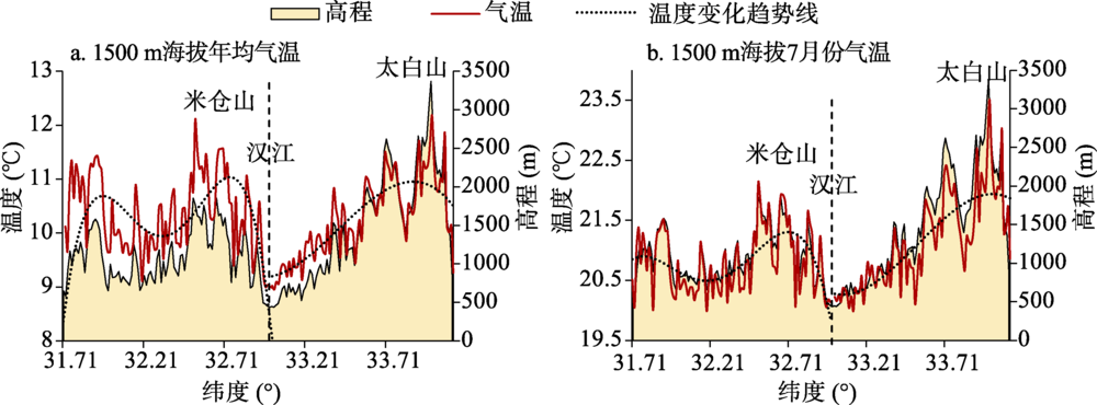 | 图8 秦巴山地107.81°E剖面线海拔1500 m年均气温与7月份南-北气温变化 |