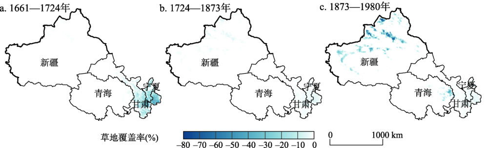 Fig. 5 Net changes of grassland cover in Gansu, Ningxia, Qinghai and Xinjiang from 1661 to 1980 |