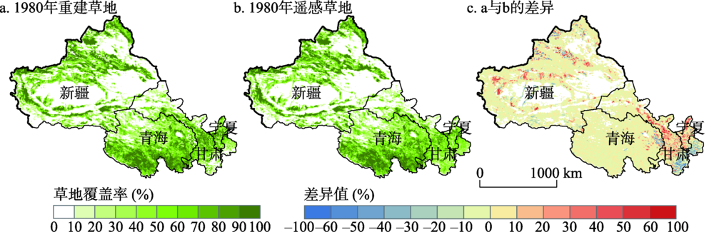 Fig. 6 The spatial patterns of our reconstruction, remote sensing-derived grassland cover in 1980, and the differences between them |