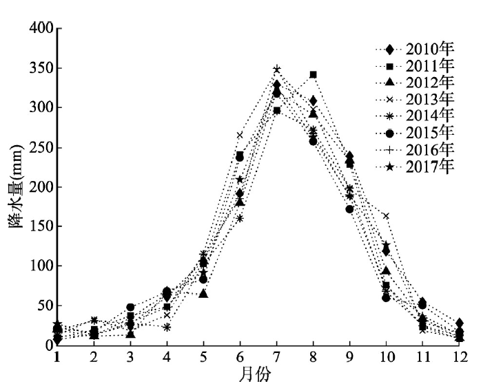 Fig. 2 Monthly precipitation from 2010 to 2017 in BIM region |