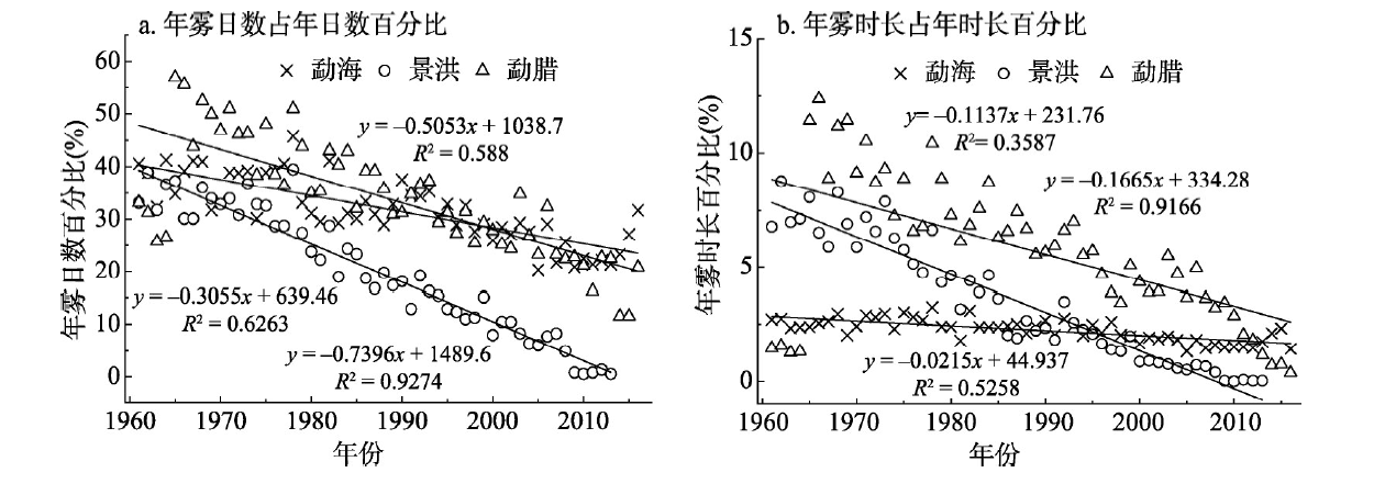 Fig. 5 Percentage of annual fog days(a) and accumulative duration of fog events(b) in Xishuangbanna |