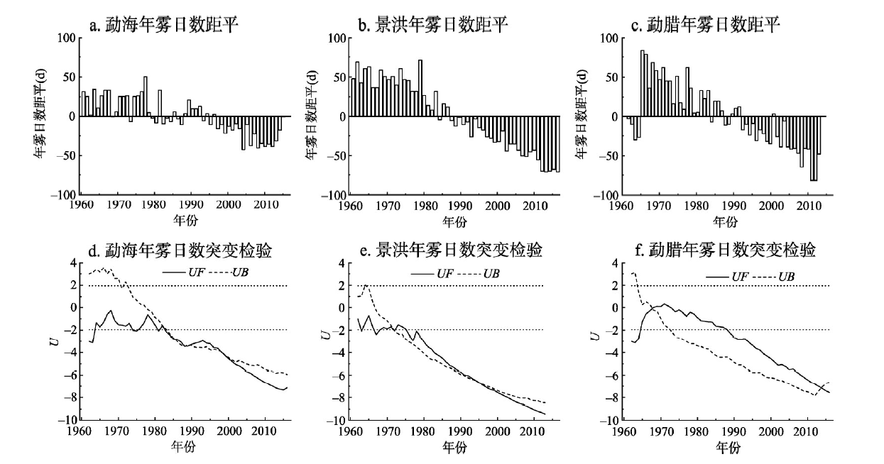Fig. 6 Anomaly distribution(a, b, c), UF and UB curves of abrupt change test(d, e, f) for annual fog days in Xishuangbanna in 1961-2016 |