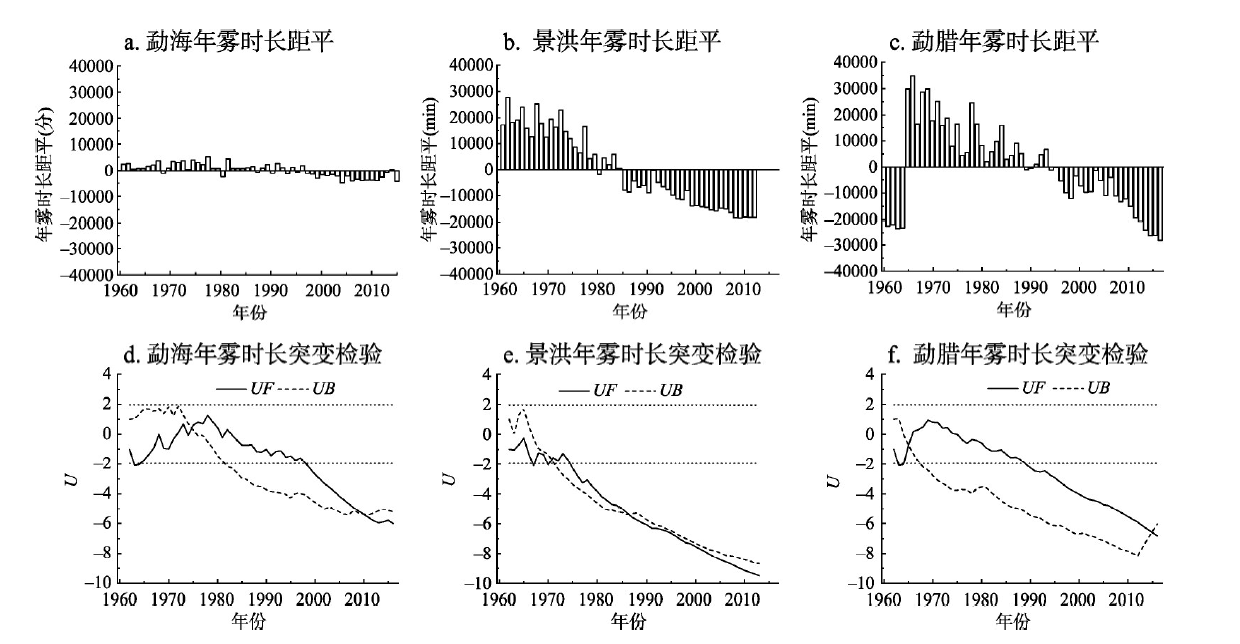 Fig. 7 Anomaly distribution(a, b, c), UF and UB curves of abrupt change test(d, e, f) for accumulative duration of fog events in Xishuangbanna |