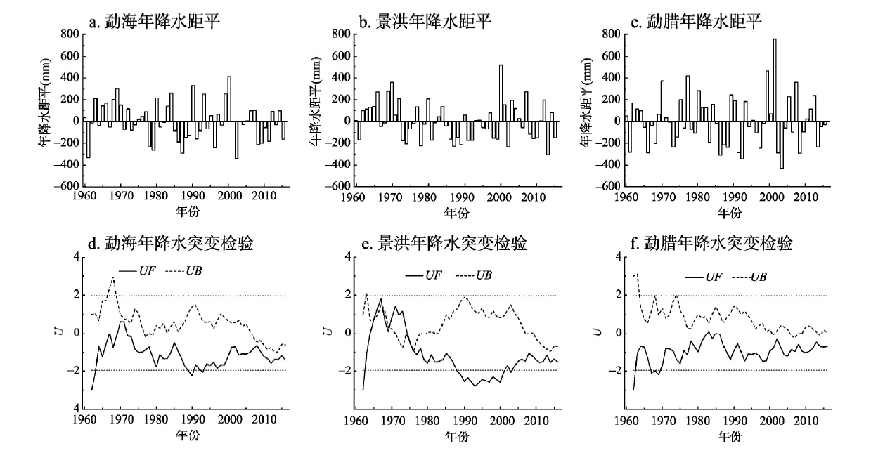 图9 1961—2016年西双版纳地区年降水量距平变化及其突变检验的UF和UB曲线 |