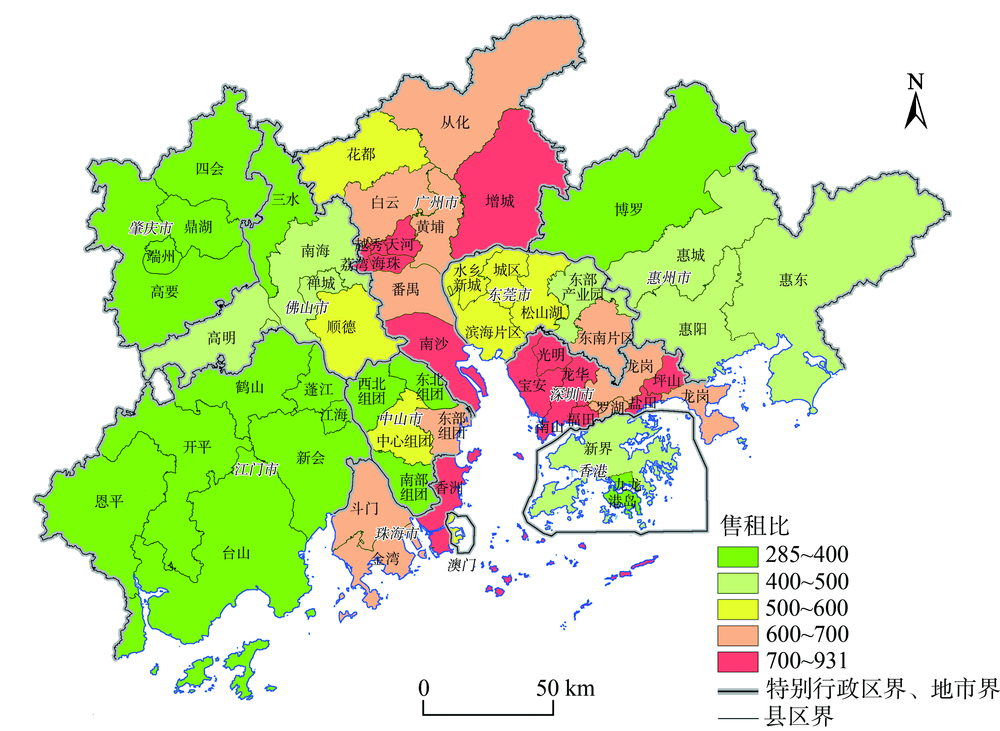 图4 粤港澳大湾区售租比的空间差异格局 注:此图基于国家测绘地理信息局标准地图(审图号:GS(2019)4342号)绘制,底图无修改;研究范围不包括珠三角外围区域的5个山区县(广宁、德庆、封开、怀集、龙门)。 |