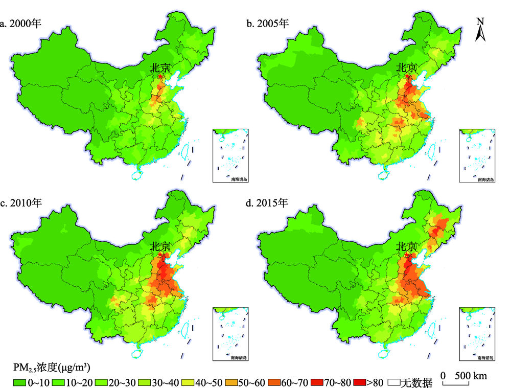 图2 全国PM2.5平均浓度的变化情况 注:此图基于国家自然资源部标准地图服务系统的标准地图(审图号:GS(2019)1825号)绘制,底图无修改。 |