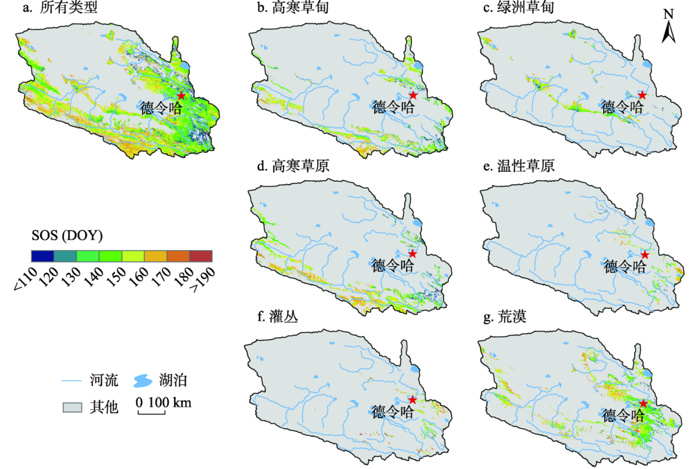 图6 2000—2019年各类型群落分布及SOS多年均值分布 |