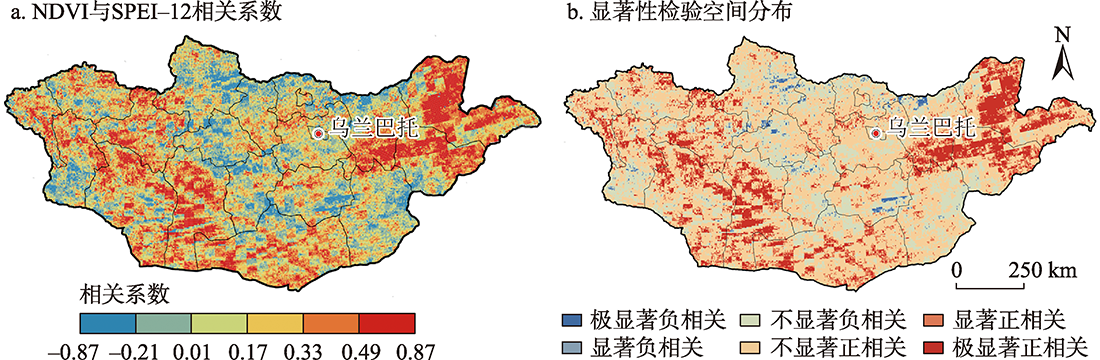 Fig. 3 Annual NDVI and SPEI-12 correlation coefficient and significance test spatial distribution in Mongolia from 2001 to 2019 |
