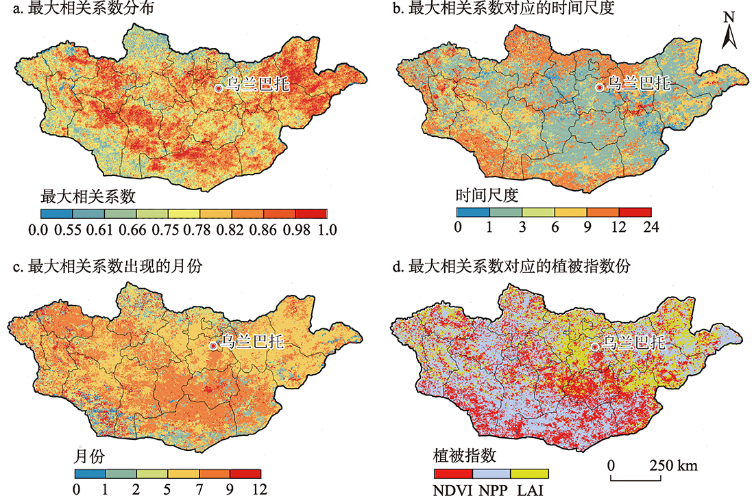 图4 2001—2019年蒙古国NDVI与SPEI相关系数的空间分布特征 注:该图基于自然资源部地图技术审查中心标准地图(审图号为 GS(2020)4395号)制作,底图无修改。 |