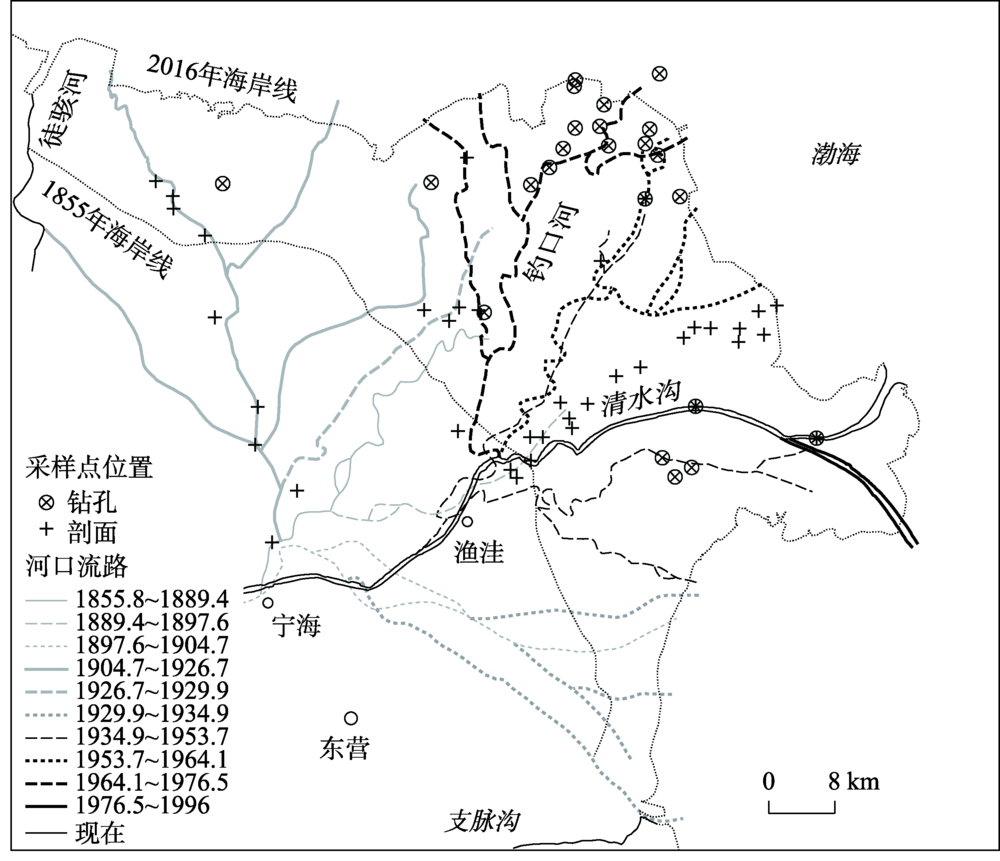 黄河三角洲及钻孔和沉积物剖面位置图