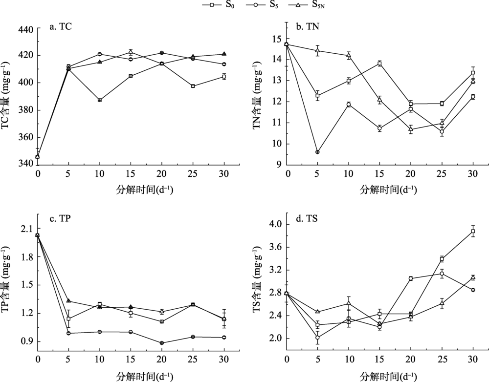 Fig. 3 Variations of TC, TN, TP and TS contents in litters as the alterations of sedimentation and nitrogen nutrient |