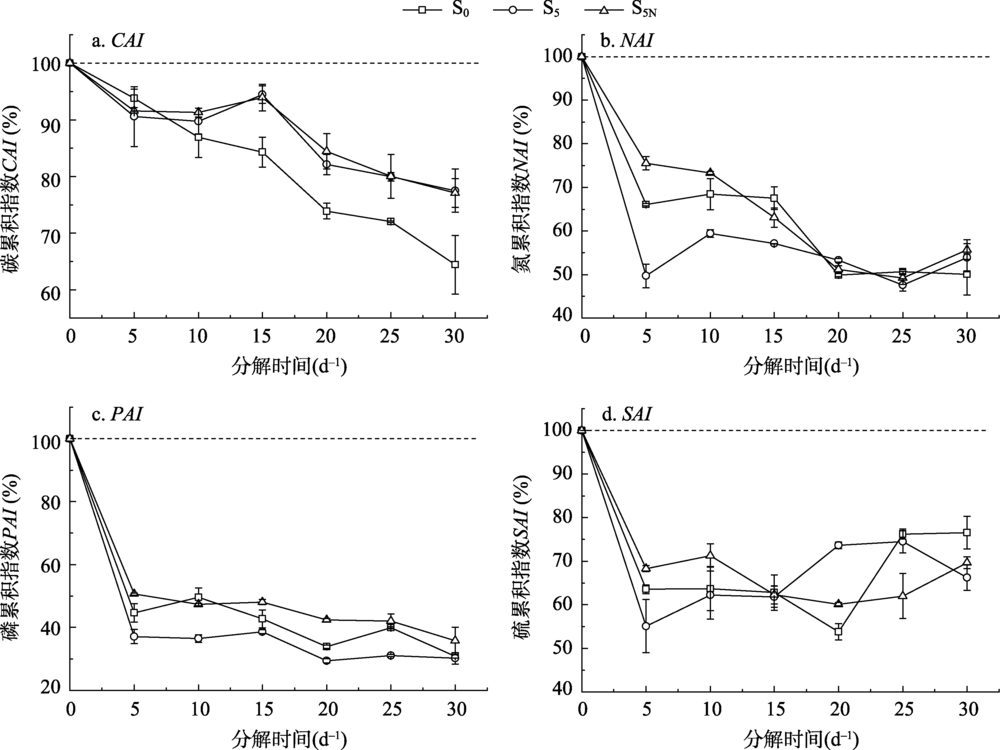 图4 沉积强度及氮养分改变条件下残体CAI、NAI、PAI和SAI变化 |