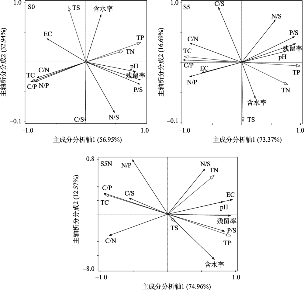 图7 沉积及养分改变条件下残体养分(TC、TN、TP和TS)含量与相关因子主成分分析 |