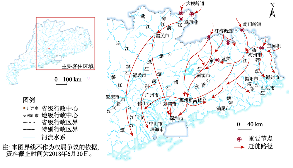 图7 由水路承载的迁徙流线 注:基于广东省自然资源厅标准地图服务网站的标准地图(粤S(2019)037号)绘制,底图无修改。 |
