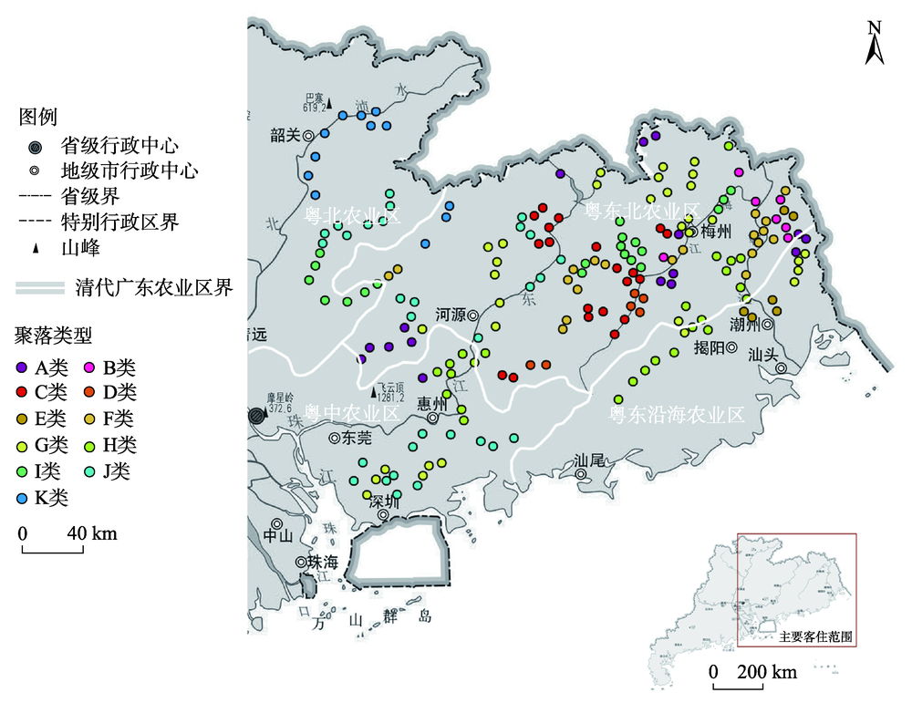 图8 广东主要客住区的农业分区(清)以及传统聚落类型的地理分布 注:基于国家自然资源部地图技术审查中心标准地图服务网站的标准地图(GS(2019)3333号)绘制,底图无修改。 |