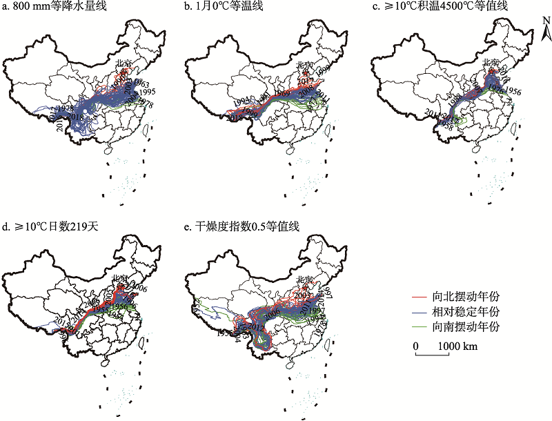图3 1951—2018年各划界气象指标等值线变动范围 注:此图基于国家自然资源部标准地图服务系统的标准地图(审图号:GS(2019)1697号)绘制,底图无修改。 |