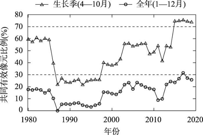 ESA CCI SM产品自带8种质量标签(数字0~7),其中flag=0表示观测数据已经过检查且不存在质量问题,flag=1表示像元所在的土壤被雪覆盖或温度低于0℃,flag=2表示像元植被覆盖度高,flag=4表示存在其他质量问题(例如模型不收敛),其余4种标签表示上述三类质量问题的组合。在数据处理过程中,只考虑flag=0的数据,其余数据全部剔除。