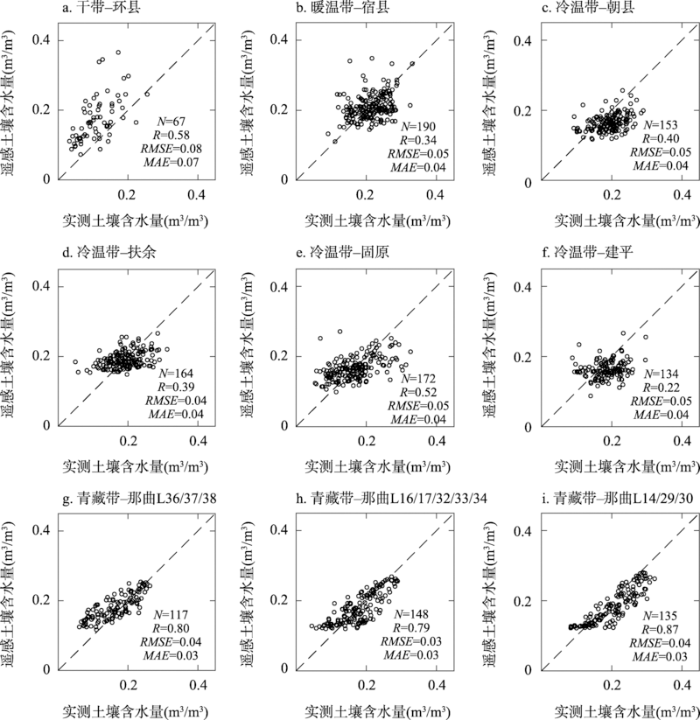 本文通过合并各气候带的站点资料建立全国尺度上的通用模型,有必要基于实测数据验证该通用模型在各气候带的反演效果。由于绝大部分站点在冬季严重缺测,因此仅考虑春季、夏季与秋季。将三个季节的验证结果求平均得到单个站点的验证结果,再对同一气候带内的全部站点求平均得到每个气候带的验证结果。通用模型在各气候带的反演效果总体较好,反演精度都随深度增加而降低。在0~40 cm范围内,通用模型的准确性表现为干带>暖温带>冷温带>青藏带,在0~100 cm范围内表现为干带>暖温带>冷温带(图5b)。