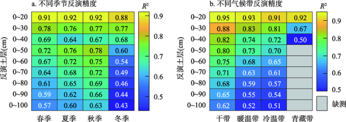 随机森林回归模型的反演精度随着土层深度增加而降低。秋季反演的准确性最高,夏季和春季次之,冬季最低。模型在干带精度最高,暖温带和冷温带次之,在青藏带最低。