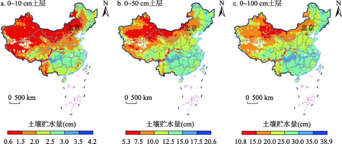 中国0~10、0~20、0~30、0~40、0~50、0~60、0~70、0~80、0~90和0~100cm 10个深度层次土壤贮水量的多年平均值及标准差分别为1.64±0.11、3.50±0.21、5.29±0.30、7.13±0.38、10.04±0.46、12.25±0.54、14.47±0.62、16.75±0.69、19.05±0.76和21.36±0.83 cm。土壤水分呈现明显的分层,即波动层(0~40cm)、跃变层(40~60 cm)和稳定层(60~100 cm)。中国1m土层贮水量具有自西北向东北和东南方向递增的分布格局。寒旱区土壤较干燥且空间变异程度较大,暖湿区土壤较湿润且空间分布更加均一。