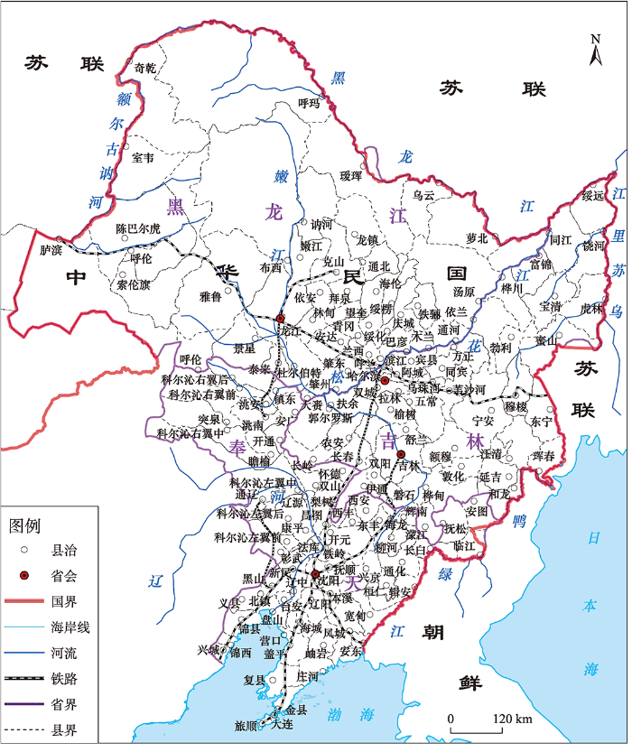 本文研究时段为“民国时期”,从中华民国临时政府成立的1912年1月1日到中华人民共和国成立前夕的1949年9月30日,历时37.75年,历经151个季节。研究区域为“东北地区”,民国时期东北地区行政沿革变化甚大,本文仅以民国十四年(1925年)行政区划为标准,当时东北地区包括黑龙江省、吉林省、奉天省和东省特别行政区,其中,黑龙江省驻龙江县,辖黑河、龙江、绥兰、呼伦4道;吉林省驻吉林县,辖吉长、滨江、延吉、依兰4道;奉天省驻沈阳县,辖辽沈、洮昌、东边3道;“东省特别行政区”仅辖中东铁路沿线两侧各30华里之区域,驻哈尔滨,伪满时裁撤。以上4省区共11道153县,国土面积约110万km2(图1)。