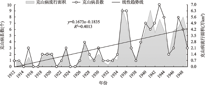 3.1.2 克山病流行的年际变化 以克山病流行县数和流行面积(指流行县的国土面积)为指标,民国时期东北地区克山病广度的逐年变化体现出十分明显的趋势变化和周期波动。在趋势变化上,线性趋势斜率为0.1673,整体呈增长趋势,说明民国时期克山病的流行范围越来越大,危害越来越严重,其中,1912—1934年克山病流行范围较小,1935—1949年克山病流行范围较大。在周期波动上,1912—1934年的波动周期时长为3~5年,1935—1949年的波动周期时长为5~8年,1935—1936年、1940—1944年、1947—1948年为克山病流行高峰期(图2)。
