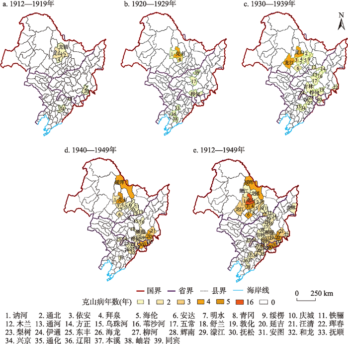 (5)就整个民国时期看,东北地区153个县域有56个发生过克山病,分布范围西至龙江,东至虎林,北达瑷珲,南至岫岩,形成了一个北部为“头”、南部为“臀”的海马状分布区域(图3e)。