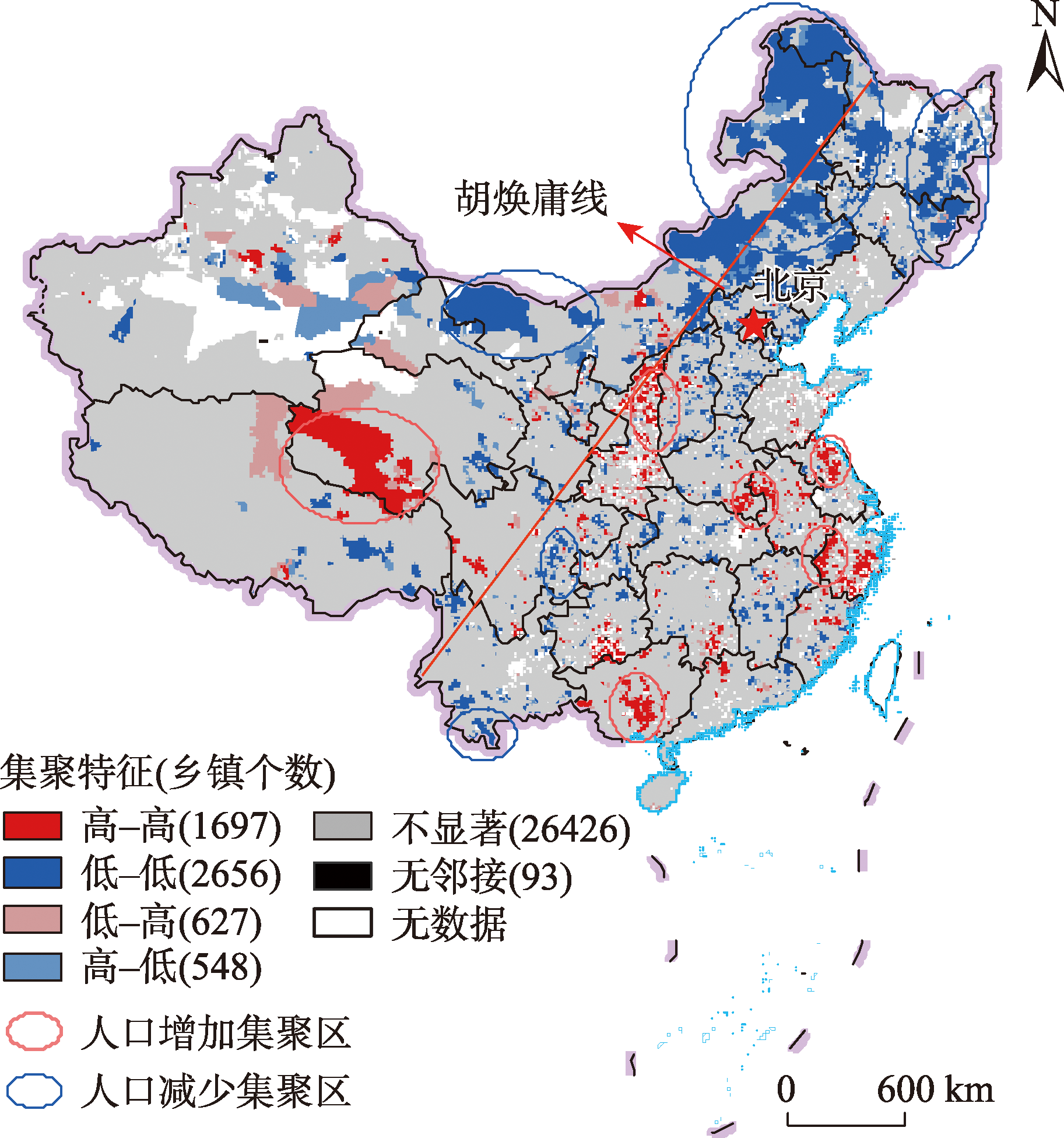 | 图4 2010—2015年中国乡镇人口变化率LISA集聚特征 注:该图基于自然资源部地图技术审查中心标准地图(审图号:GS(2019)1819号)绘制,底图无修改;图例中无邻接的空间单元主要为一些沿海岛屿。 |