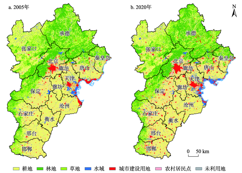 | 图1 2005年与2020年京津冀城市群土地利用空间分布 |