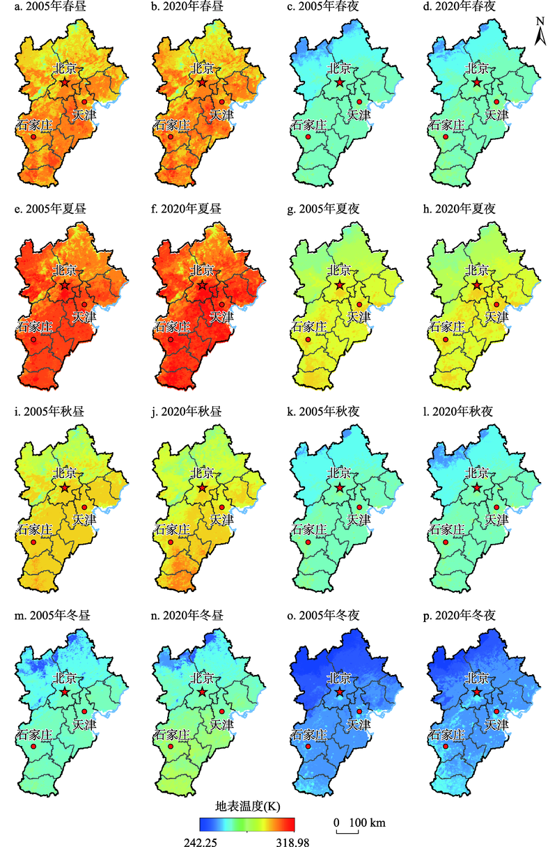| 图4 2005年与2020年京津冀城市群地表温度 |