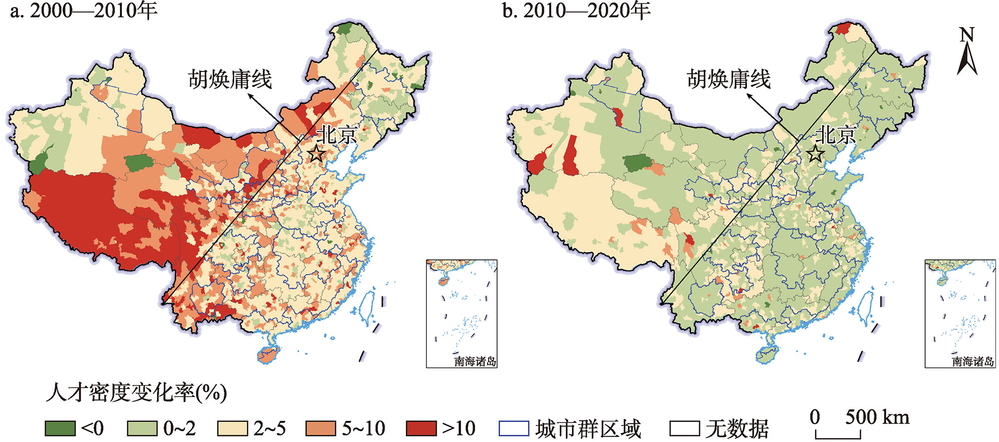 | Fig. 2 Spatial variation of the density of highly educated talent in China, 2000-2010 and 2010-2020 |