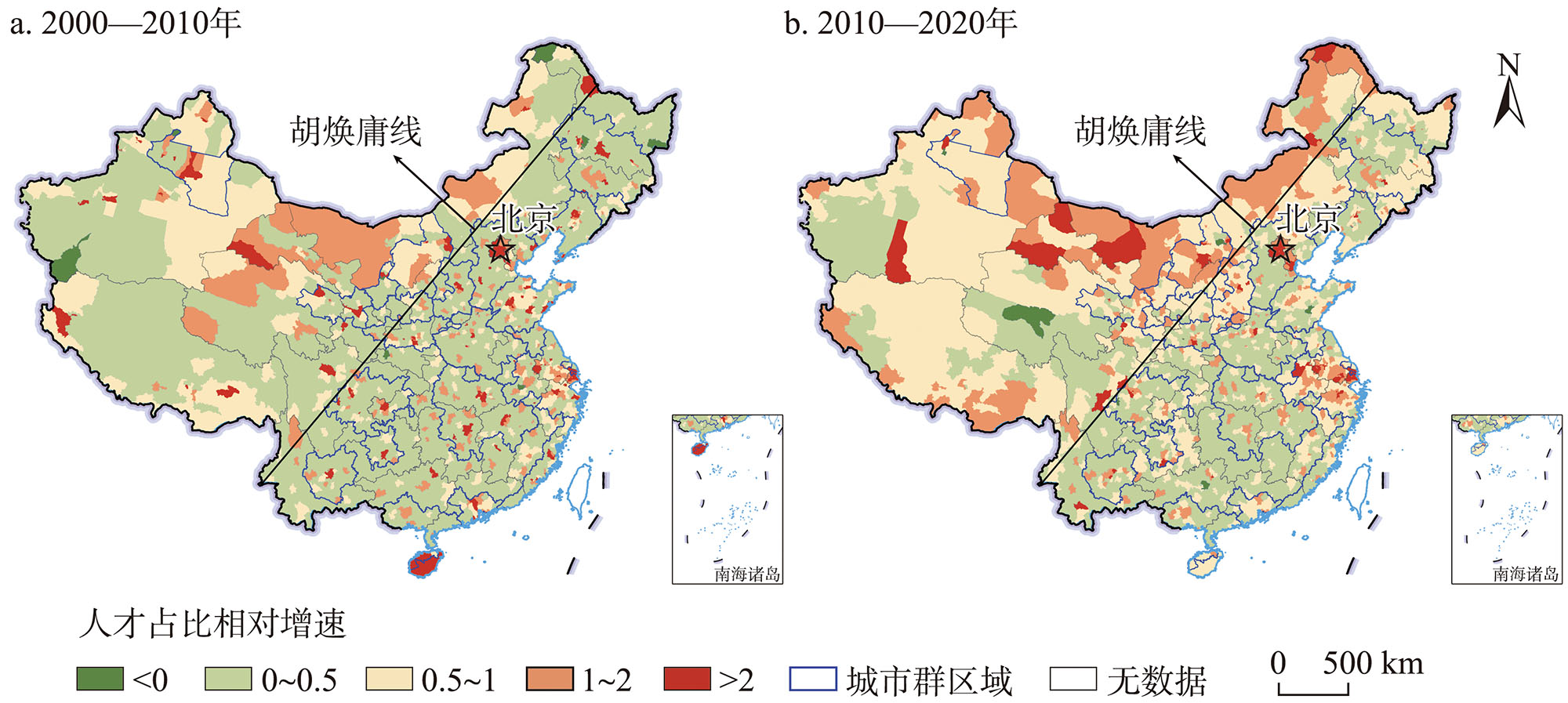 | Fig. 3 Spatial variation of the share of highly educated talent in China, 2000-2010 and 2010-2020 |