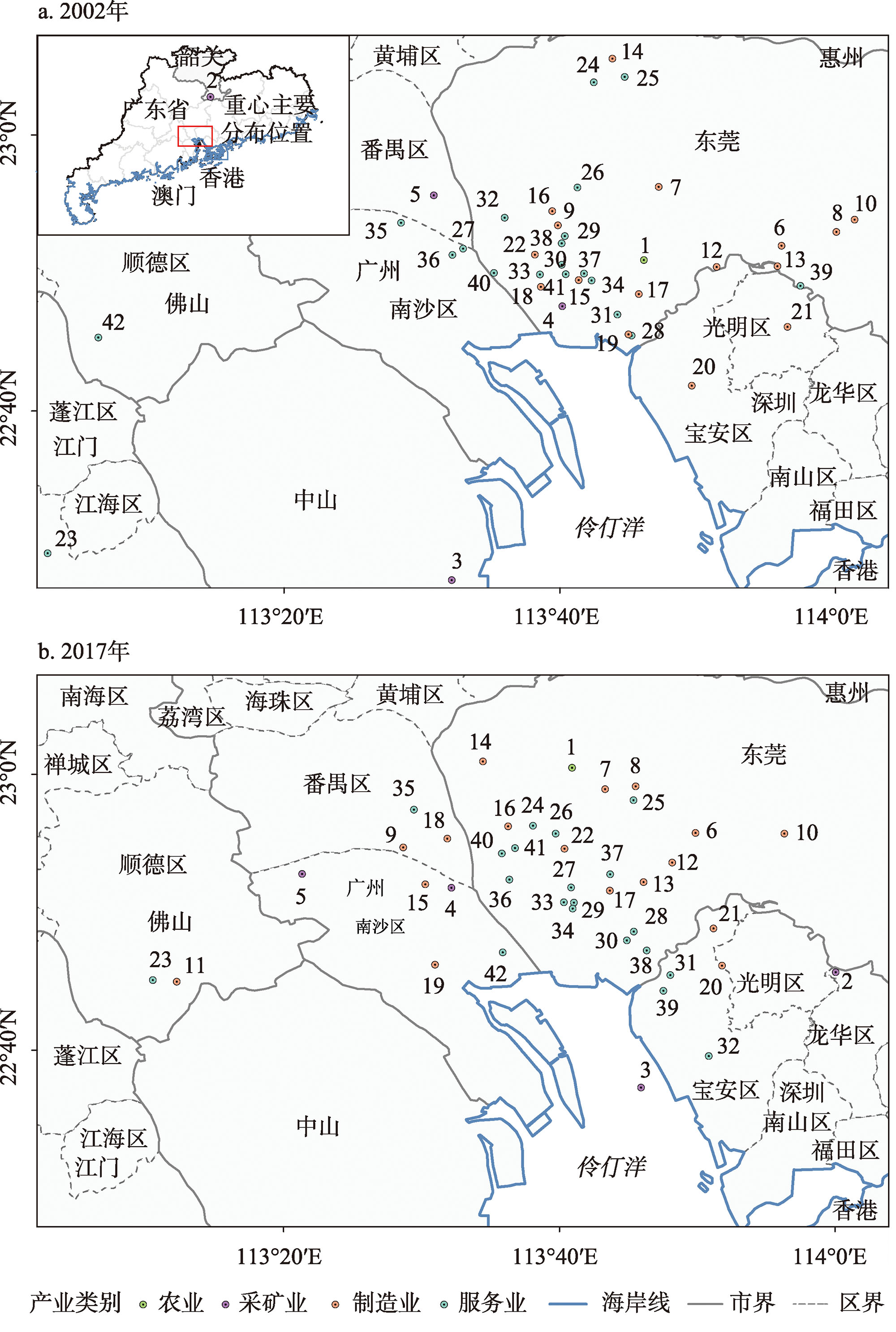 | 图7 广东省产业空间重心分布 注:产业编号与产业名称对应关系见 |