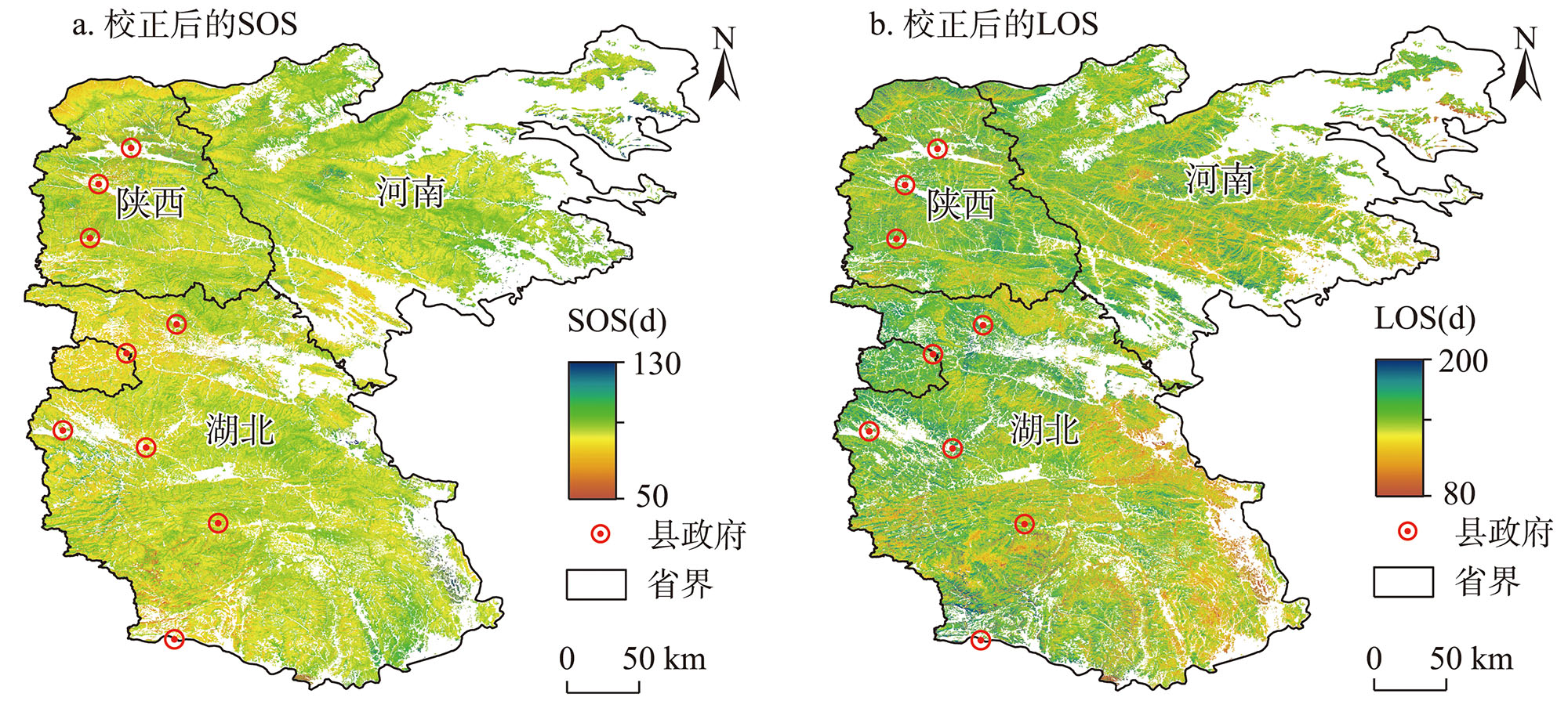 | Fig. 8 Spatial patterns of SOS and LOS of vegetation in the eastern Qinling-Daba Mountains after correction of elevation |