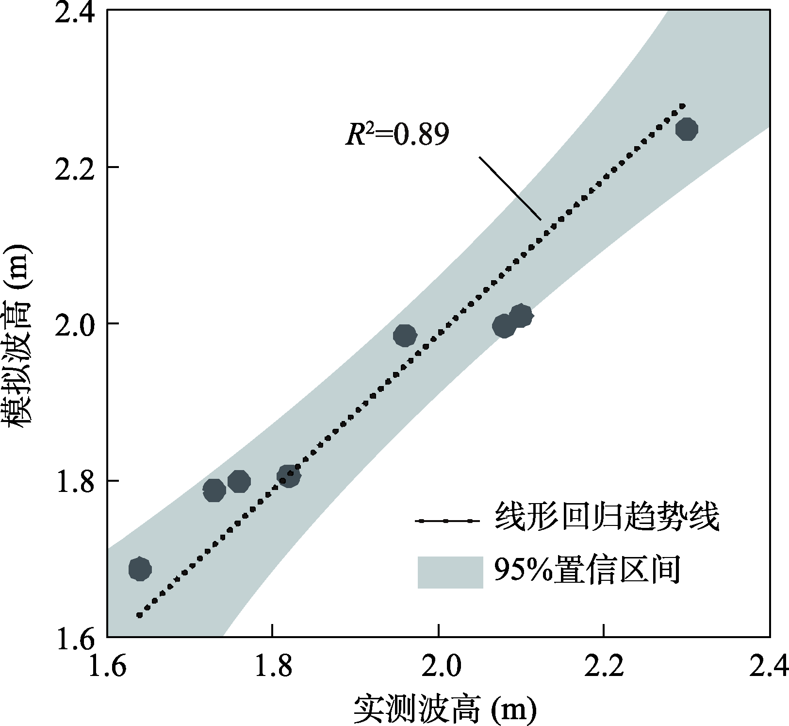 | 图4 2014年台风“凤凰”过境时刻9个淹水时段波浪高度测量值与模拟值对比 |