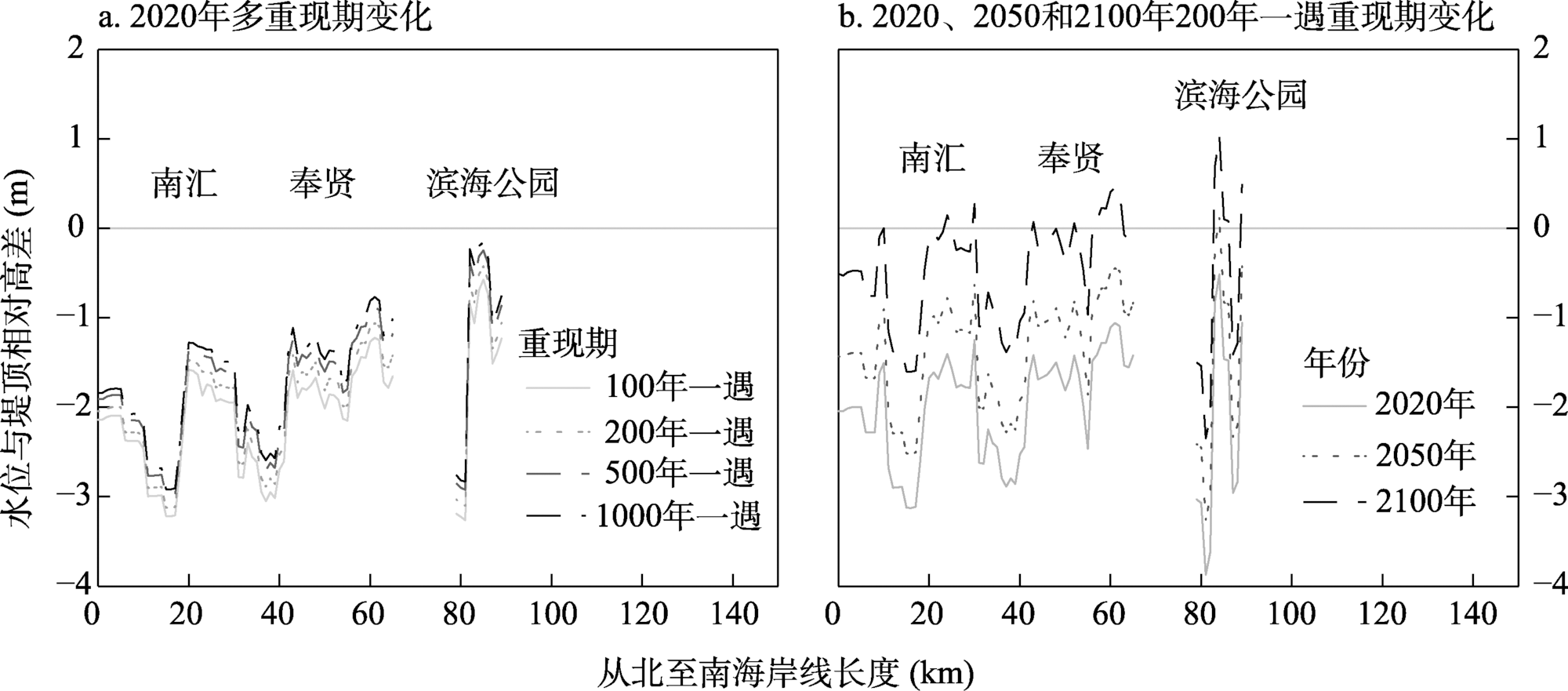 | Fig. 8 The relative height difference between the water level and the seawall top along the Shanghai section of North Hangzhou Bay |