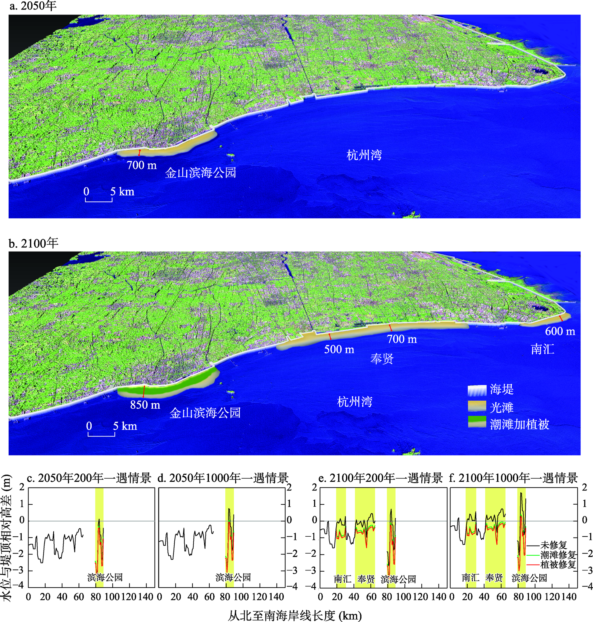 | 图9 杭州湾北岸2050和2100年潮滩修复与波浪高度测试 |