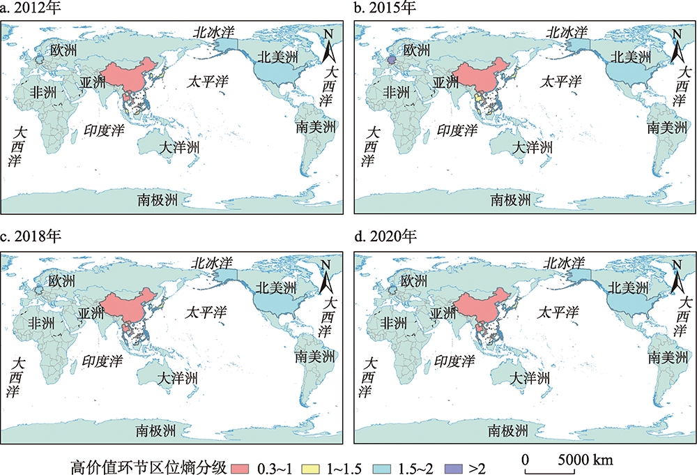 | 图3 2012—2020年各国家或地区在高价值环节区位熵变化 注:该图基于自然资源部地图技术审查中心标准地图(审图号:GS(2016)1666号)绘制,底图边界无修改;图中仅显示区域熵较高且供应商子公司分布数量较多的国家或地区。 |
