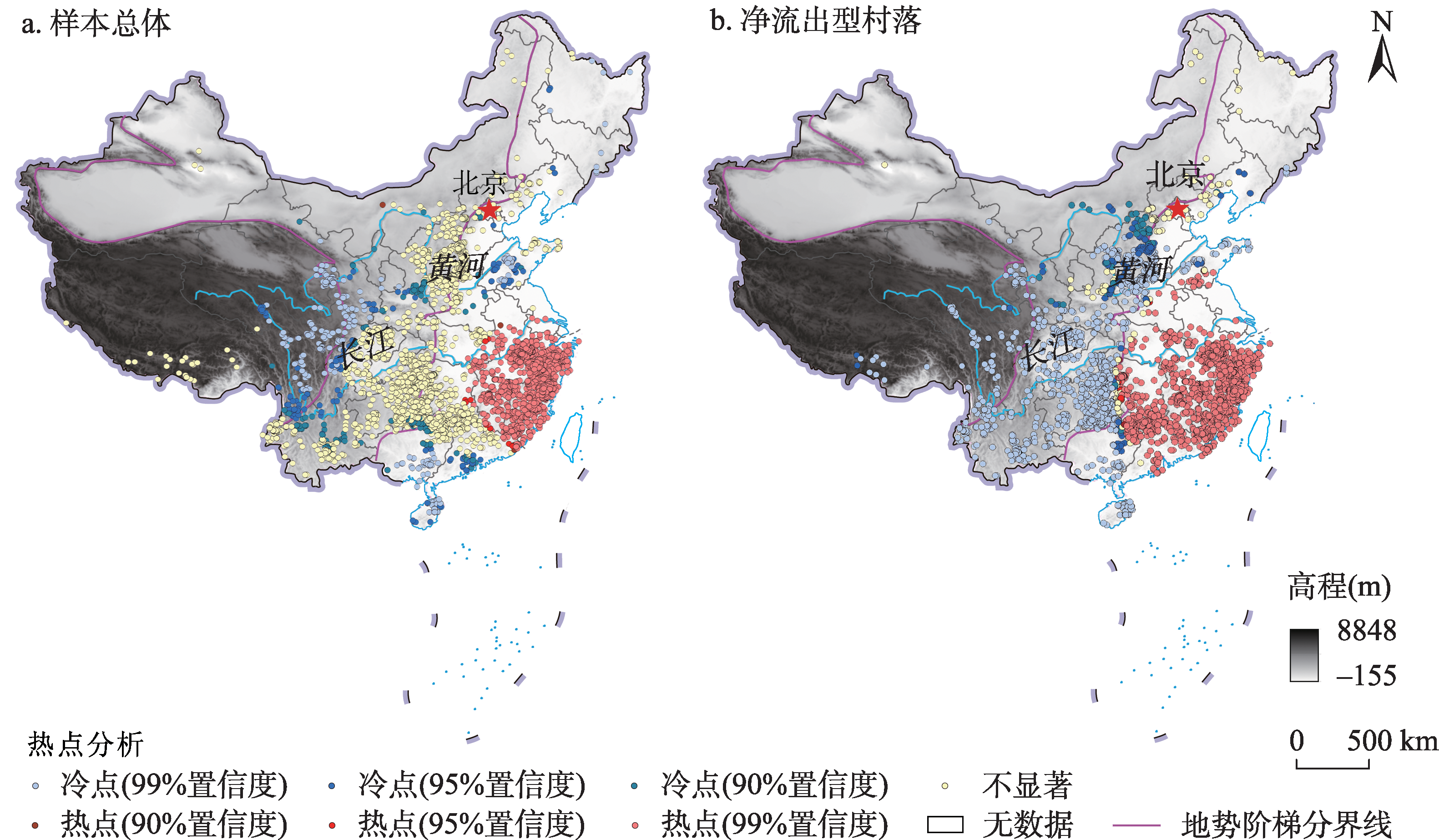 | 图5 中国传统村落人口外流率的热点分析 注:该图基于自然资源部地图技术审查中心标准地图(审图号:GS(2019)1697号)绘制,底图边界无修改。 |