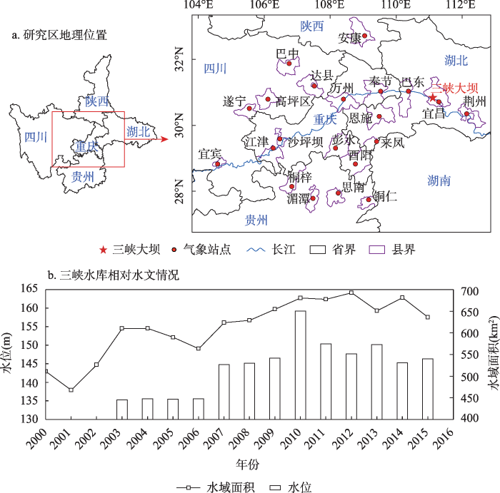 三峡大坝是世界上最大的水利枢纽工程,同时是治理开发长江流域的关键性骨干工程,其具有防洪、发电以及航运等多方面功能。三峡大坝始建于1993年,于2003年蓄水位至139 m后开始发电,2009年蓄水位达到175 m,三峡库区总库容达393亿 m3,全长约600 km,平均宽度为1.1 km,总面积达1084 km2[24]。三峡库区的范围大约在29°16′N~31°25′N、106°50′E~110°51′ E之间,库区位于四川盆地和长江中下游平原的结合部,跨越鄂中山区峡谷及川东岭谷地带,西起重庆江津,东至湖北宜昌,包括重庆市22个县(区)以及湖北省的4个县,总面积约5.8万km2。三峡库区属于亚热带湿润季风气候,气候表现为冬短夏长,降水充沛但季节分配不均,具冬干、夏雨、伏旱、秋淋的特征[29]。库区地处于大巴山褶皱带、川东平行岭谷和川鄂湘黔隆起褶皱带交汇处,背倚大巴山,南抵云贵高原[30]。库区内地形较为复杂,奉节以东属川东鄂西山地,奉节以西属川东平行峡谷低山丘陵区,山高坡陡,高差悬殊,河谷深切。河谷平坝约占库区总面积的4.3%,丘陵占21.7%,山地占74%。库区内物种资源丰富,主要植被类型为常绿阔叶林、落叶阔叶混交林、落叶阔叶林与常绿针叶混叶林、针叶林和灌草丛等[31]。研究区地理位置、气象站点分布及三峡水库相对水位、水域面积情况[32]18,25见图1。