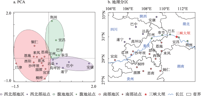 基于PCA结果,可将研究区大致分为3个区域:西北部地区、腹地地区以及南部地区(图2)。西北部地区包括安康、达县、高坪区、巴中、遂宁5个站点;腹地地区包括荆州、宜昌、巴东、奉节、万州5个站点;南部地区包括恩施、来凤、铜仁、酉阳、思南、彭水、湄潭、桐梓、沙坪坝、江津、宜宾11个站点。