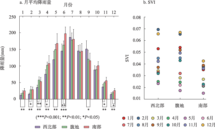 结合各区域多年月平均降水量及月时间尺度下的变异性(SVI)分析得出(图3),各区域月平均降水量特征:均为夏多冬少、南部>腹地>西北部。西北部与南部在多个月份(1—6月、9月、11—12月)均存在显著性差异(P<0.05),西北部与腹地在2—4月以及11月的降水量存在显著性差异,而腹地与南部仅在6月和12月存在显著性差异。三个区域在7—10月的差异不大,表明随季风深入各区域形成稳定强降水。各区域在月时间尺度下的变率特征:1月、2月、12月大,3—9月变率小;西北部>腹地>南部。不难看出,3—9月降水量主导全年降水,1月、2月、12月降水量恰为全年最小,即降水量多的月份对该地区降水量变率影响不大,而降水量较少的月份对该地区降水量变率影响较大。