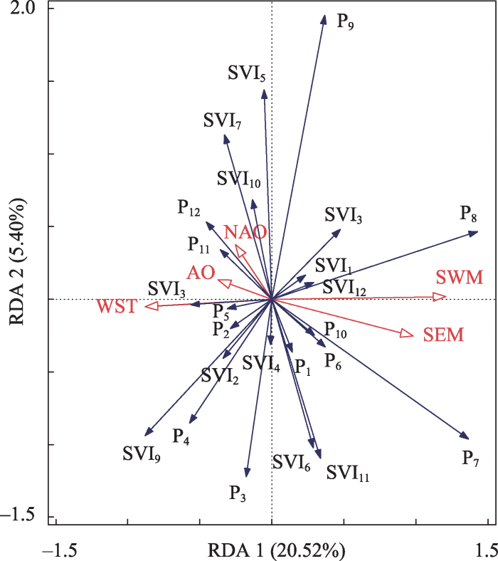 考虑到气候驱动因子(WST、SWM、SEM、AO、NAO)对降水的影响存在季节性特征,本研究选取各区域月降水以及与区域月降水关系显著的气候驱动因子,按lg(100x+1)转换上述指标的数据矩阵以消除量纲和极端值的影响,应用RDA分析将月降水和气候驱动因子的多元对应关系降维处理,在二维排序图上直观呈现月降水参数和气候驱动因子的关系,同时得到气候驱动因子对RDA排序轴的解释度和显著性。采用与RDA排序轴具显著关系(P<0.05)的气候驱动因子作自变量,以三峡水库2003年蓄水前的年降水量作因变量构建线性回归方程,并基于回归方程计算2003年以后的理论年降水(即无三峡水库情形下的理论降水)。经配对样本t检验验证水库蓄水后理论年降水与实测降水的显著性差异以评估非气侯影响因素(如水库效应)对降水的影响。