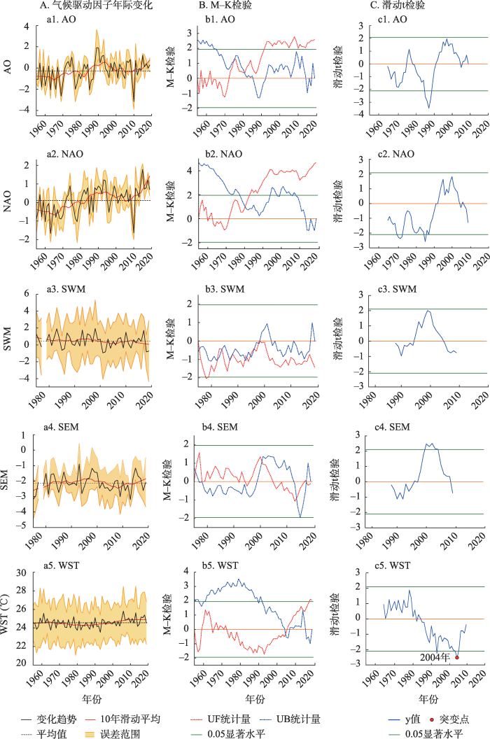 单因素方差分析、配对样本t检验、Kendall′s tau-b非参数相关性分析、多元线性回归在SPSS 22中完成,M-K检验、滑动t检验以及WTC在Matlab 2020b完成,PCA和RDA分析在软件Canoco 5.0中完成,作图在ArcMap 10和Origin 2017pro中完成。