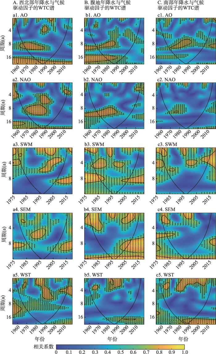 表1 各区域不同时间尺度下降水与驱动因子的Kendall′s tau-b相关性