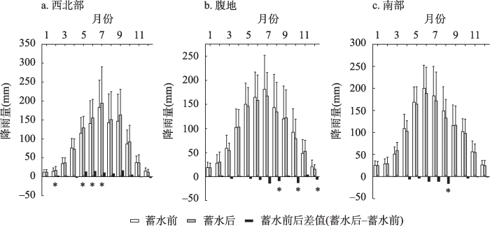 大型水库通过湖泊效应可能会对局地气候产生一定的调节作用[16]。这是由于大型水库显著改变了下垫面类型,从而影响地表水汽的蒸散发速率。水库的存在会降低下垫面温度,减少气流的上升运动,增加低层水汽辐散从而导致降水减少;同时也会减少云量,增强净辐射量,下垫面升温,引起更多的水汽蒸发导致降水增加[17]。可见,大型水库对周边地区降水的影响效果是前述情况的综合结果,因地而异且影响范围和结果多样化。例如,林浩等[18]认为大型水库明显影响区域气候,总库容在10亿 m3以上,水面面积超过100 km2的大型水库的气候影响区域的面积大致同水库水面面积相等或略大,平均距离从几公里到数十公里。如安康水库蓄水后,除冬季外的其他各季、年、主汛期降水量都比蓄水前有所减少,且秋季、年、主汛期蓄水前后差异显著[19]。小浪底水库蓄水后,库区降水的下降趋势较蓄水前明显减弱,蓄水后库区内年降水量略有增加,而周边降水量略有减少[20]。基于数值模拟的结果显示:美国佛森大坝修建后,大坝下游地区的最大降水量相比于建坝前有所增加,而上游地区的最大降水量则有所减少[21]。也有研究表明,大型水库修建对局地降水几乎没有影响[22]。总而言之,水库蓄水后对区域降水的影响亦存在不确定性。目前的研究结果倾向性认为大型水利工程会改变周围地区的小气候,尤其在水库蓄水后对其局部气候影响较大[23]。