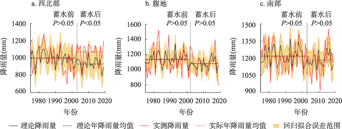 为探究1955—2019年研究区各区域降水量是否存在突变现象,经M-K检验及10年滑动t检验得知:尽管库区西北部存在UF和UB的多个交点(即潜在的M-K突变点),但是仅有1987年、2003年的降水突变点通过了显著性水平检验(P<0.05),即认为西北部降水在1987年、2003年存在突变,其中,西北部2003年的降水突变是否与三峡水库蓄水有关需进一步探究。同理,腹地年降水未通过显著性水平检验(P>0.05),认为其降水不存在突变点;南部仅在1994年存在一个降水突变点。