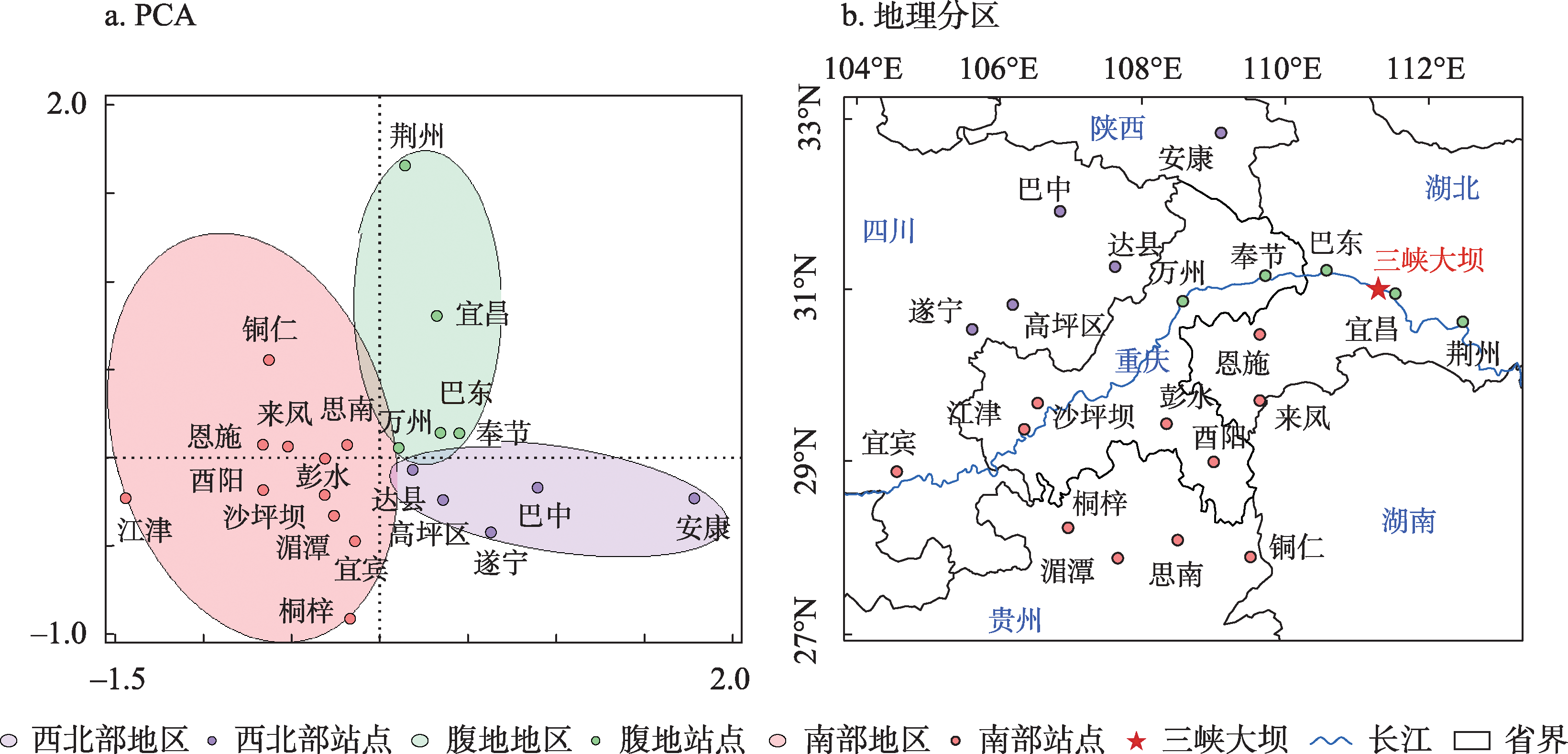 | Fig. 2 PCA results based on precipitation amount, SVI of precipitation and geospatial parameters for spatial cluster of weather stations |